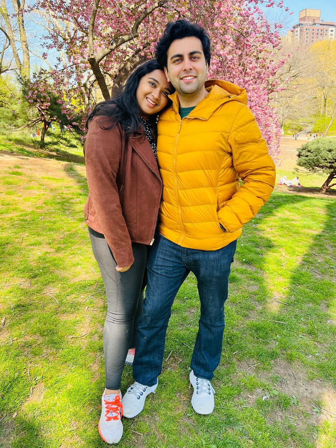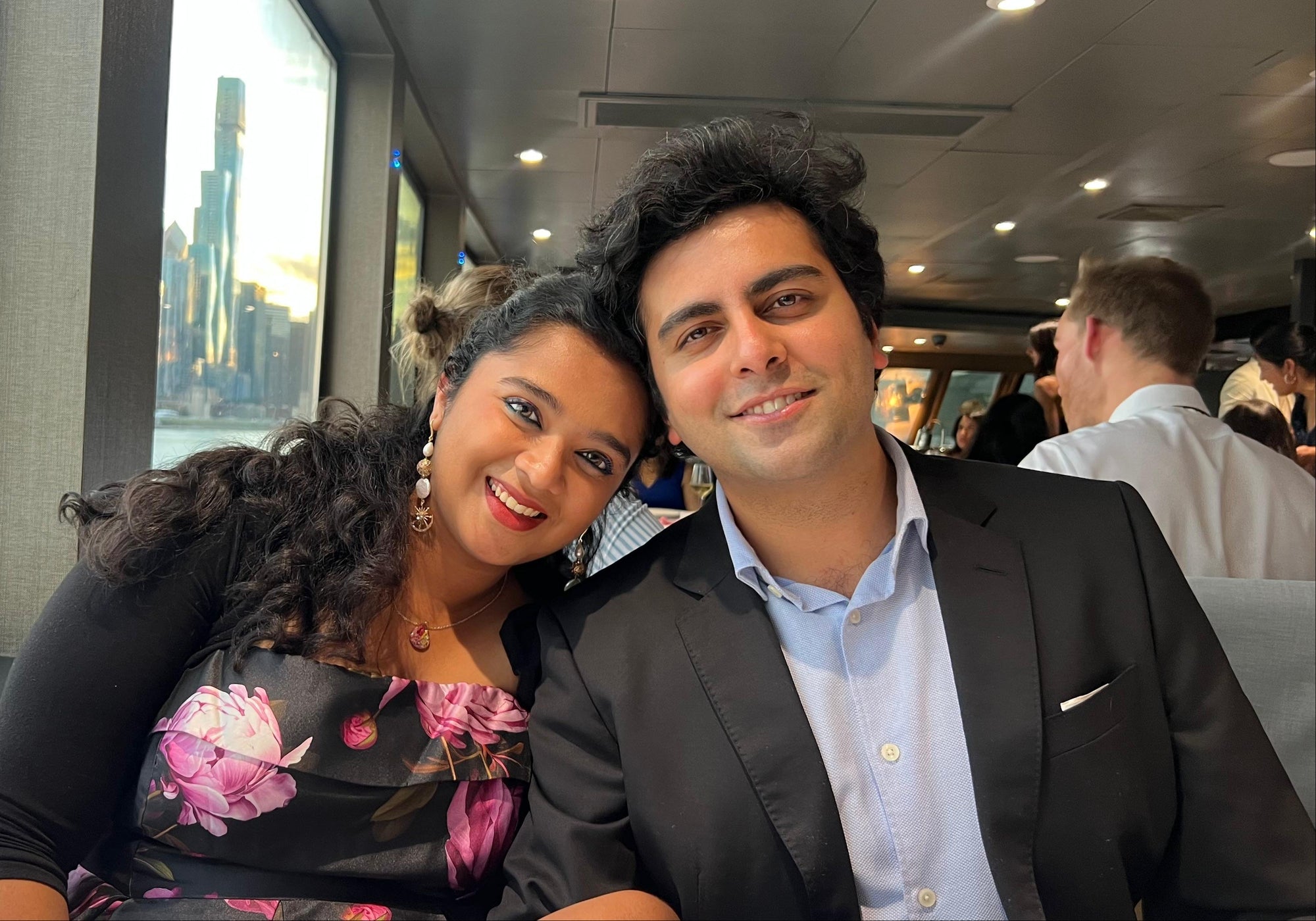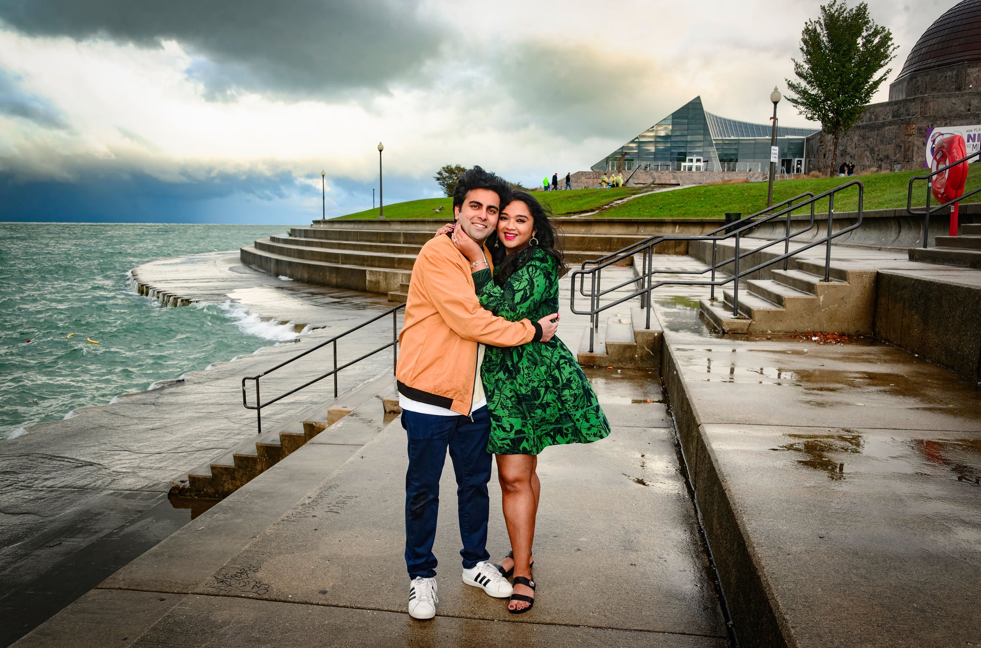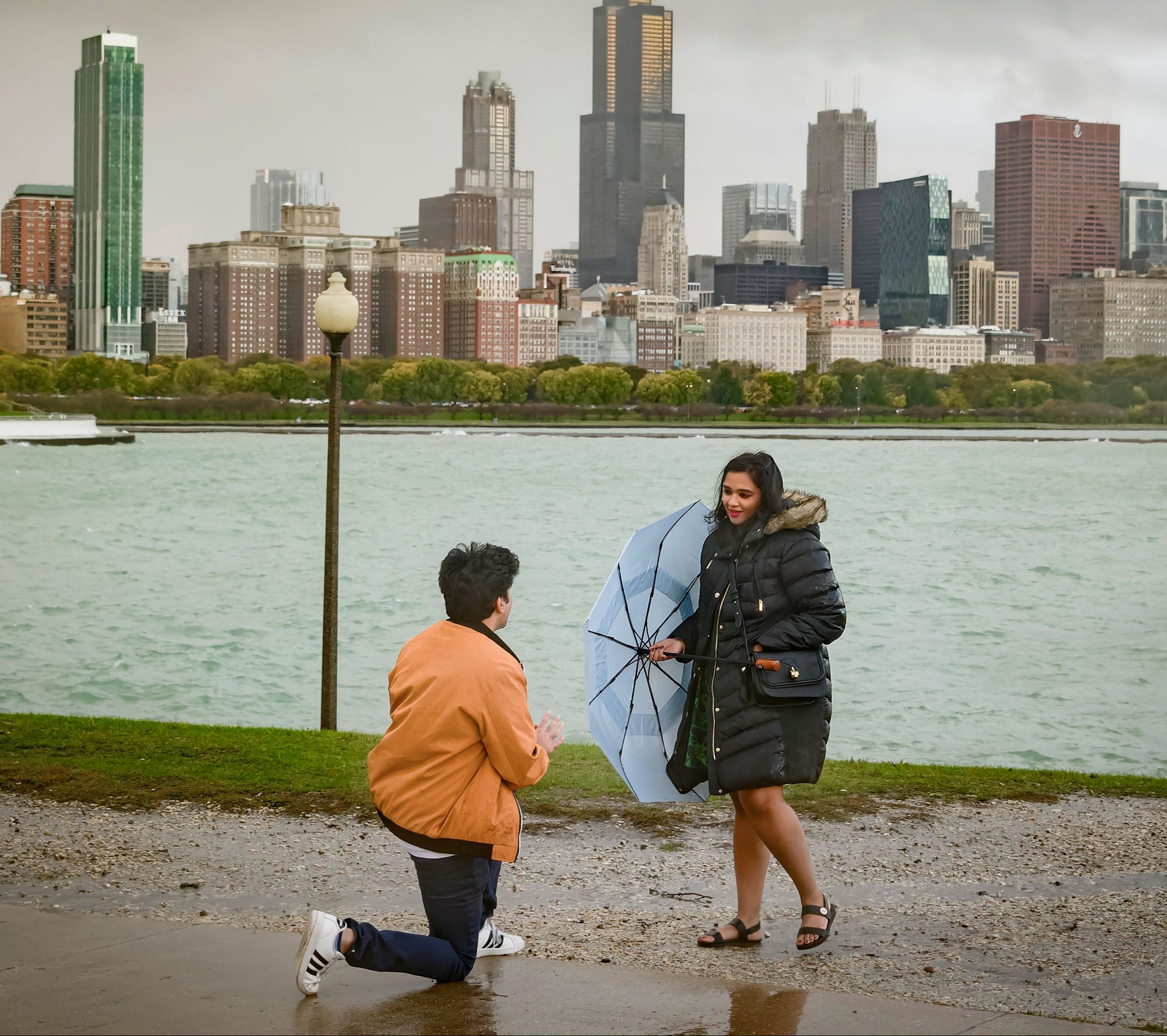 Their first home together was Chicago, where Adhiraj proposed on a stormy, rainy lakeside afternoon that ended, dramatically and perfectly, with a rainbow and a burst of color across the sky. A little chaos, a little magic, and a moment that felt exactly like them.